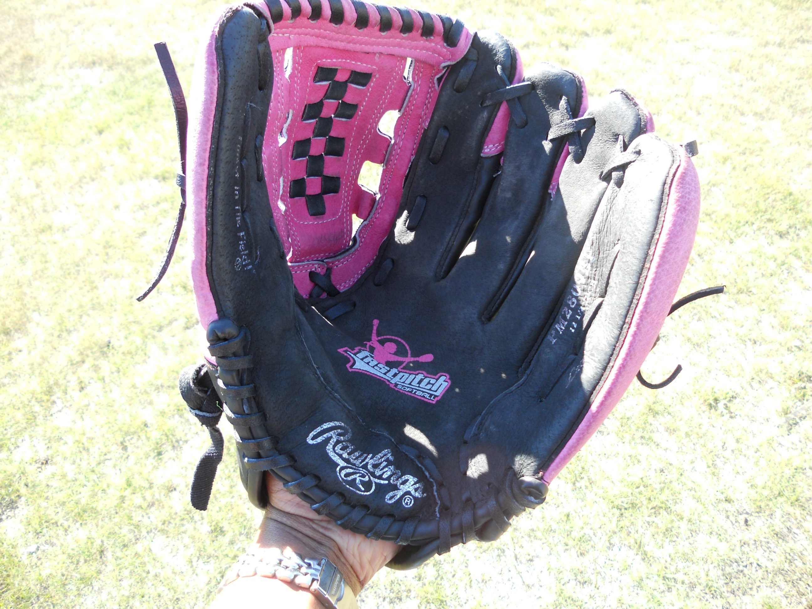 At lunch time I popped over to Canadian Tire and, faced with a plethora of gloves, of various sizes, materials, right-hand and left-hand, I was instantly overwhelmed. The only store assistant that I could find was from the Philippines, who told me that he had never played baseball, so he was as clueless as I was. A quick phone call to my co-worker sorted out that I needed a glove for my left hand. Good thing, because I would have bought a right-hand one, since I’m right-handed. The other selection criteria were up to me, so I chose a glove that I figured I couldn’t go wrong with: something in pink.