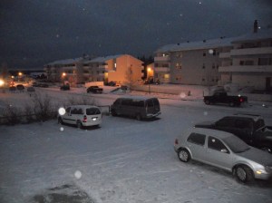 me as very odd to drive by schools in Yellowknife and see the children running around the school-yard and on the jungle gyms and slides in the dark, fully engrossed in their games, completely unfazed by the darkness. Frankly, I think that I shouldn’t have to rise before the sun does, and that if my body were meant to be out in frigid weather I’d have been born with fur. The hibernating animals are the only sensible mammals up here.