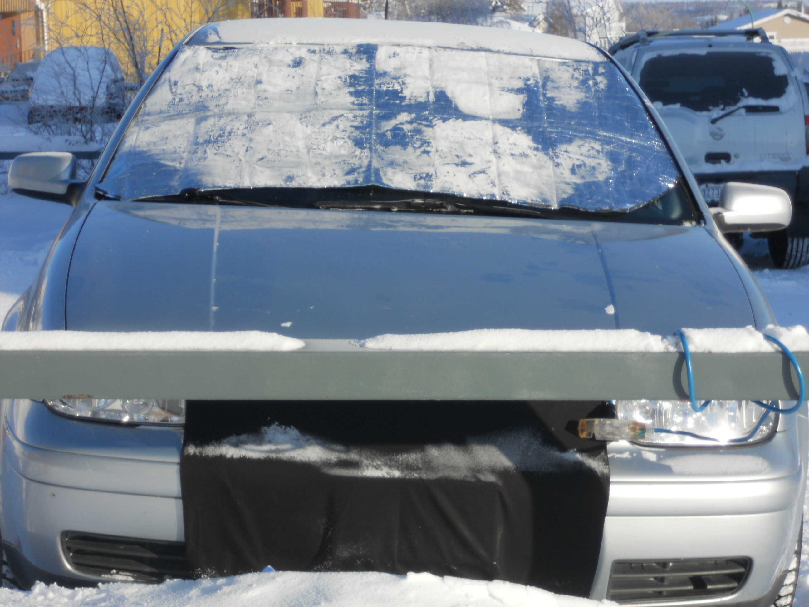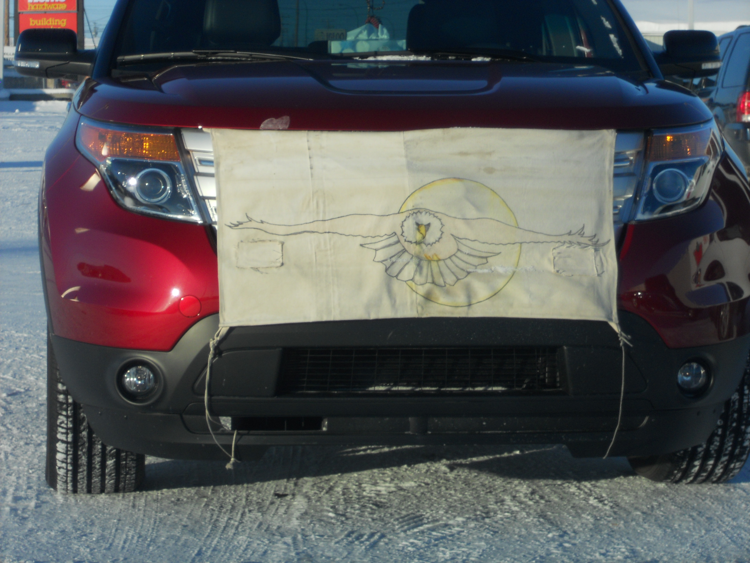 Actual driving finally takes place at step 4. When the car starts moving, it moans and groans in protest, it creaks and squeaks, things rattle and it sounds heavy, like the Batmobile. If flights at Yellowknife airport can be cancelled because it’s “too cold to fly”, there really should be times when it’s deemed too cold to drive. Another one of my kind colleagues at work fitted my car with an engine grille cover, while he was in the process of making one for his vehicle. It’s supposed to keep the cold air out of the engine to prevent it from freezing, or to keep the heat in, depending on how you look at it. I’ve seen them on many vehicles around town.