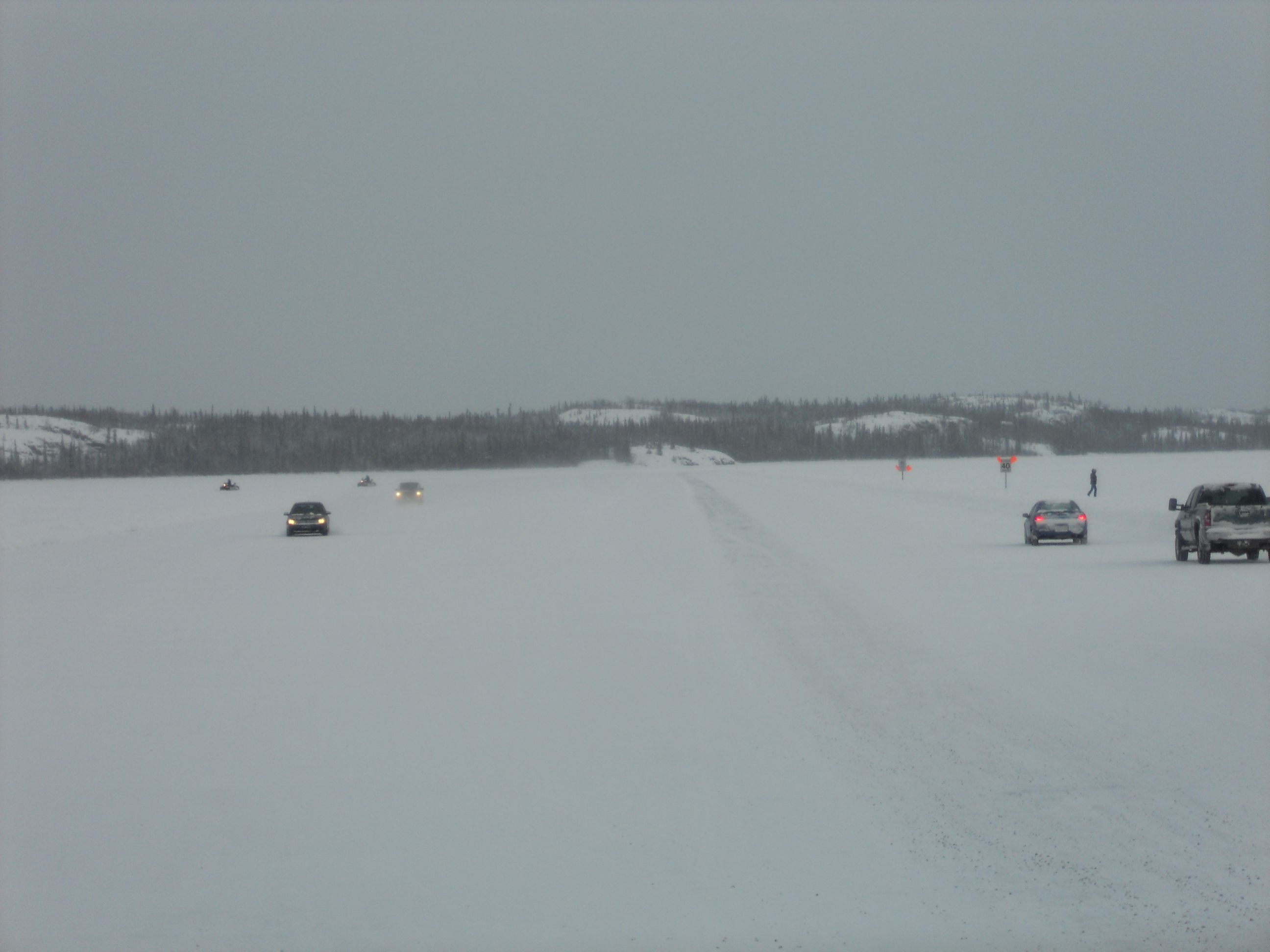 My favourite place to go for a drive is on the ice road between Yellowknife and Dettah. Despite having done it countless times, it always feels somewhat adventurous. This road is carved on the frozen surface of the Great Slave Lake and it opens in late December or early January, when the ice is thick enough and the temperature is consistently cold enough to maintain it. It’s a marvel that a few feet of ice are all that separate me from water so frigid that I’m positive that I wouldn’t survive more than 10 seconds in it. Equally astonishing is that the ice is strong enough to support a small car or a heavy truck, and you can hear it cracking as it flexes. There are people who go cross-country skiing, snowshoeing, walking their dogs and snowmobiling on the lake as well, so motorists have to look out for people, dogs and snowmobiles crossing the road. The road is built very wide, (by my estimate at least 3 lanes in either direction with a generous median) and the speed limit on it is 40km/hr. The fine for speeding is high, up to $860. The reason for this excessive penalty is that speeding vehicles create bigger waves in the water under the ice, which can damage the road, and repairs are costly, sometimes requiring road closure. When you consider that some northern communities are accessible by land only in winter thanks to ice roads, and that the diamond mines also use them for seasonal transportation, one speeding motorist can disrupt life for a lot of people.