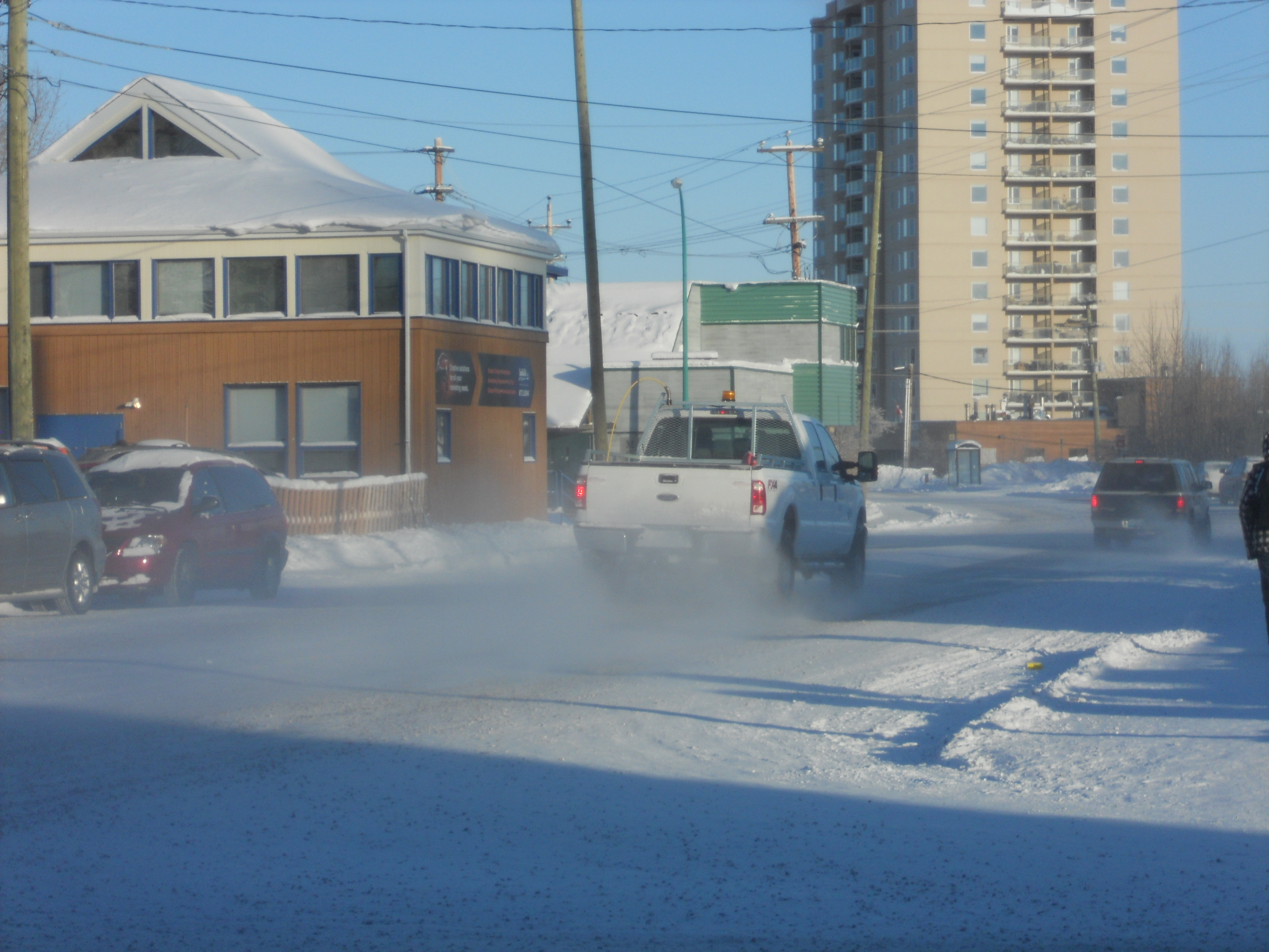 Car ownership and driving in Yellowknife are definitely different from down south. For one thing, our licence plates are unique, shaped like polar bears. When it comes to driving conditions, the road surface varies, as snow ploughing is infrequent. Due to the dryness of the climate, the snow here falls in dry, light, feathery flakes, but it hardens like concrete. So it requires scraping up, rather than ploughing. Salt has no effect at frigid temperatures, so gravel is spread to provide traction. This gravel is the cause of many a cracked windshield, and clouds of dust in the spring, but at least we don’t have to worry about rusted car under-bodies. However, when it’s very icy, I don’t know if any amount of gravel would make a difference, as there have been times when I have barely been able to slide to a stop.