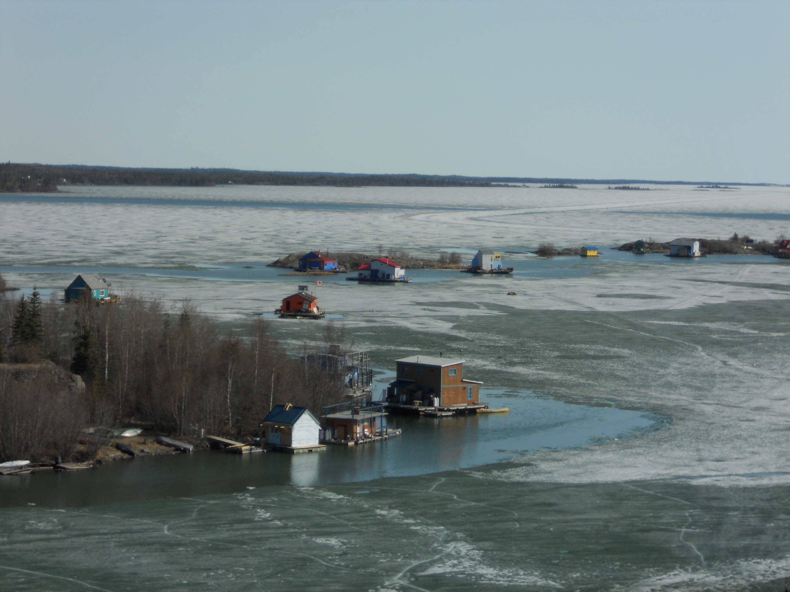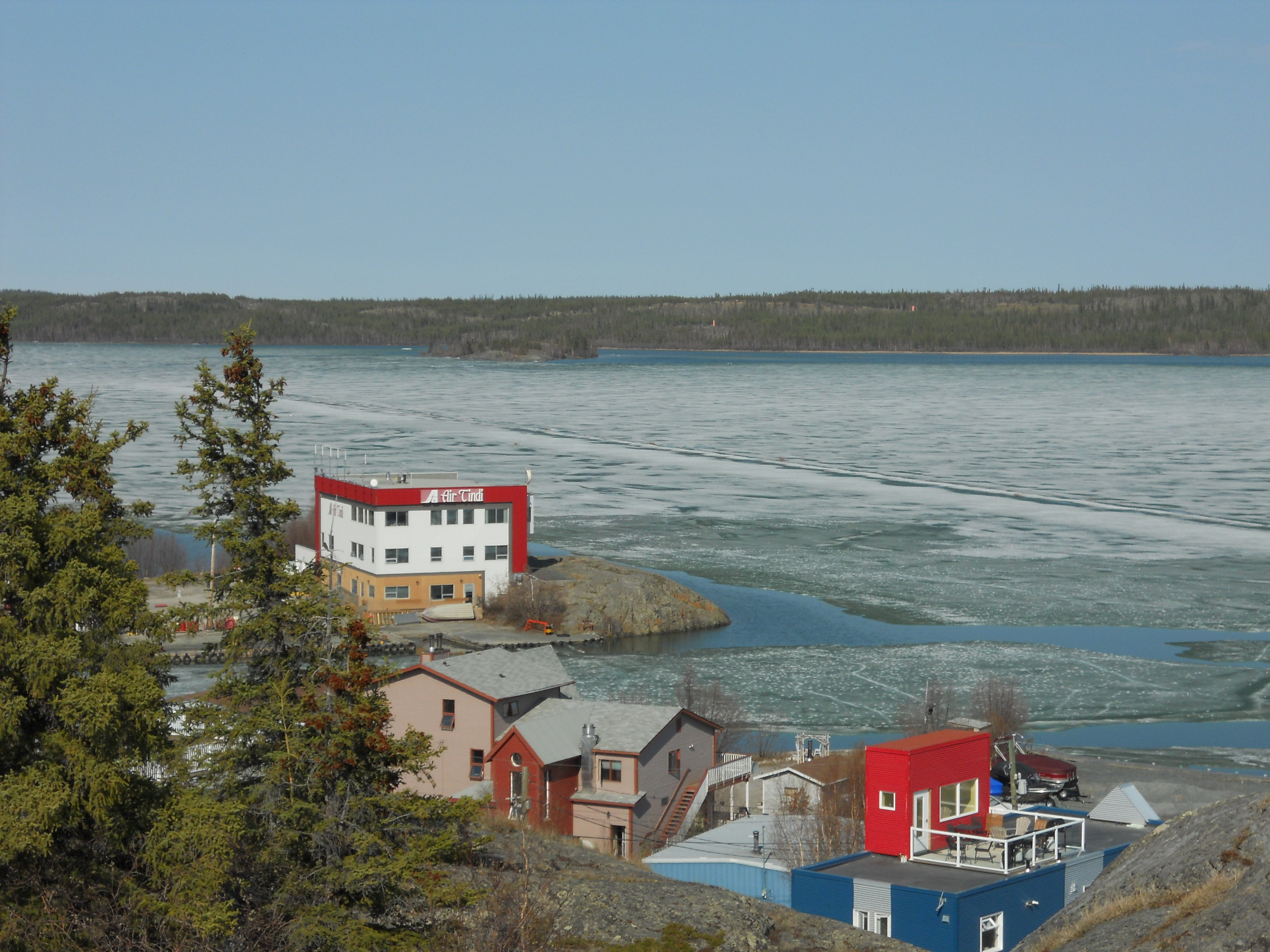 The smaller lakes have thawed out by now, but there is still ice on the Great Slave Lake, although it’s weakening daily. A rather intrepid musher and his dog-team fell through into the icy waters earlier this month and needed to be rescued. I could happily live my entire life without that kind of adventure. In the area between the mainland and Jolliffe Island are the last vestiges of the ice landing strip for small planes. During the summer, float planes skim the water in this area.