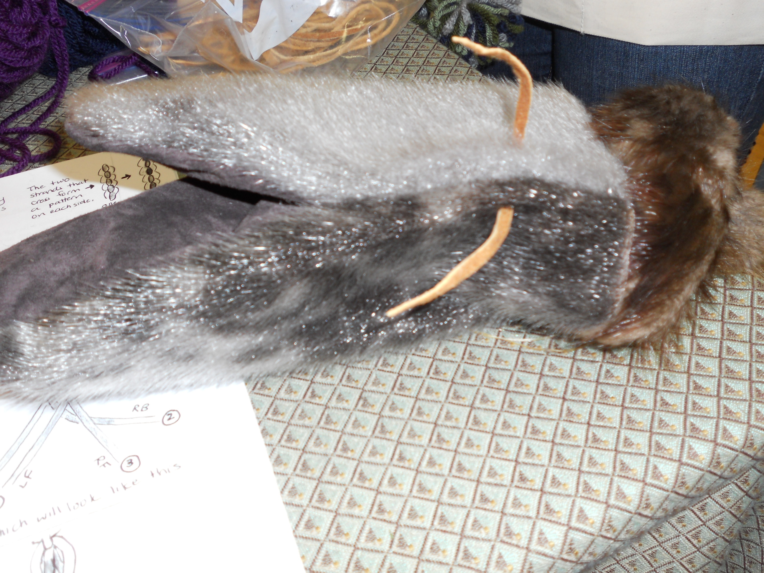 The first thing we did was to choose the pattern that fit our hand size, then choose a seal pelt and trace and cut out the pattern. I was surprised at the variation in the fur of the pelts. Some of it was dark grey, some a lighter shade of grey, with spots in shades of brownish-black, and there was one that was completely black. All of the fur had a healthy gloss. The thickness of the pelts varied, evidently due to the season in which the animal had been caught.