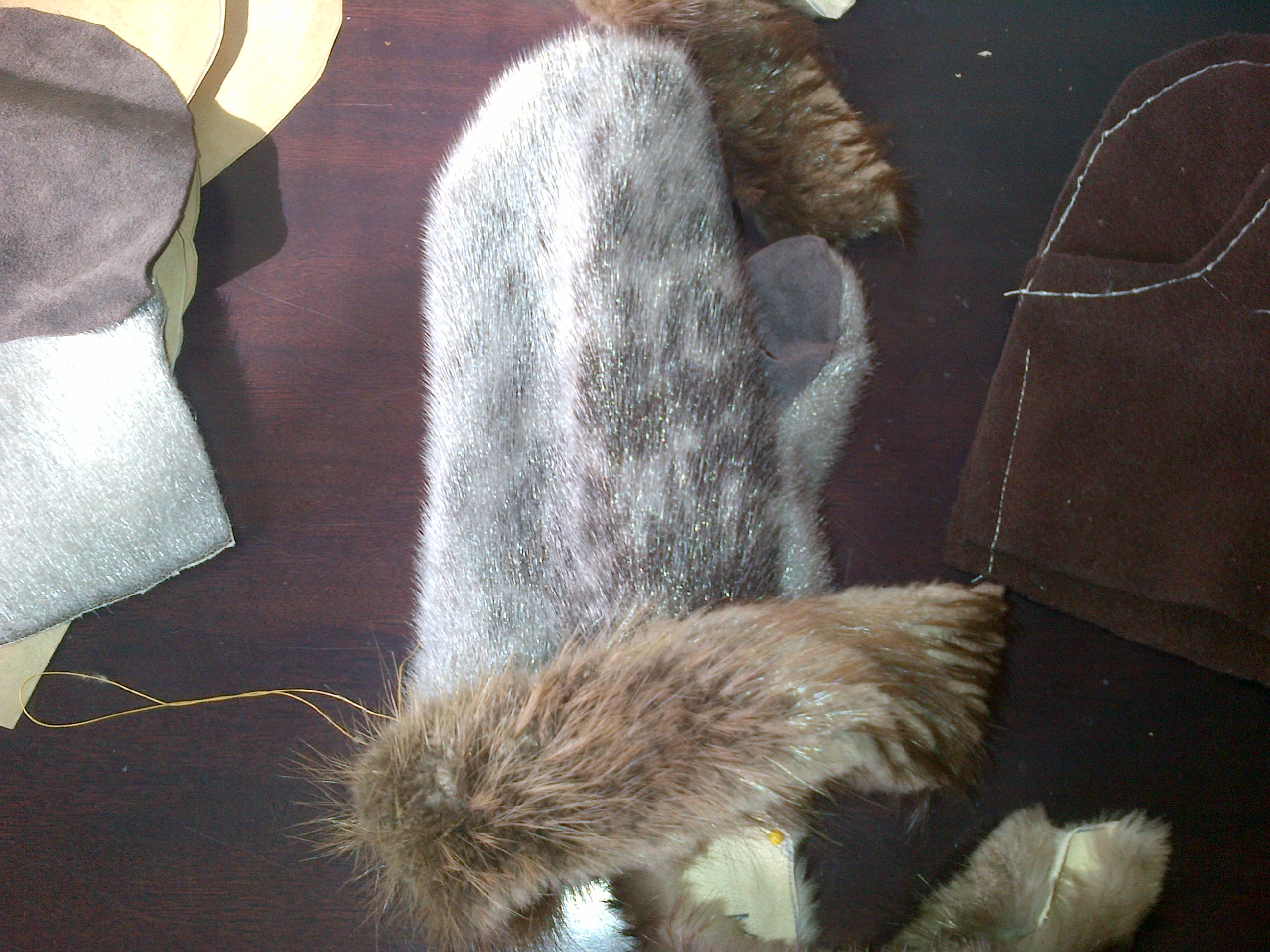 Finally, we added a cuff of beaver fur. The fur on sealskin is a flat fur, if there is such a term. It’s like a carpet, whereas beaver fur stands up more, hence the reason that it was placed at the cuff, to keep the cold air out. It was a bit more difficult to sew the beaver fur on, because the long hairs kept getting in the way and had to be constantly flattened. By the end of the class, I managed to finish one mitten…almost.