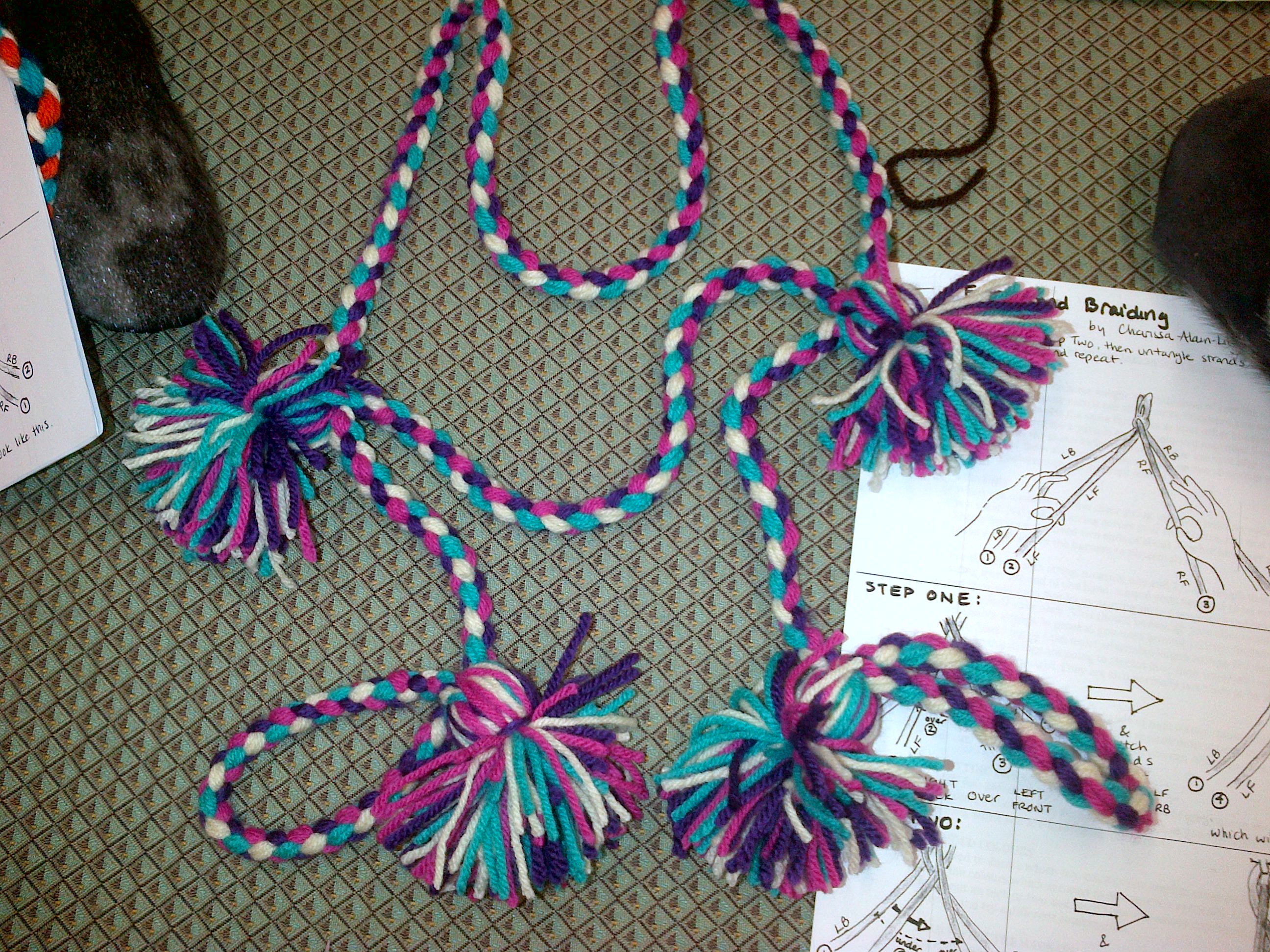 To make the harness, we selected 4 different colours of wool, and measured double the length of our arm span for the strand that held the mittens, and 1.5 times the width of our chest for the harness portion. The braid was made with a 4-strand braiding technique, by which we crossed 2 colours each of yarn over the other 2 colours. All I’ll say is that it’s easier and faster to do it with a partner, so there are 4 hands. For decoration, we added pom-poms, which were remarkably simple to make. This is my finished harness. Take a good look at it, because if you ever see it lying near a hole in the ice, please summon the fire department right away.