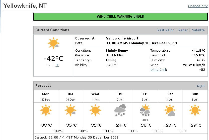 This year, temperatures in the -40s Celsius began in early December, accompanied by ice fog, to add insult to injury. It was as if Mother Nature just couldn’t wait for the winter solstice to begin her huffing and puffing. This is my 3rd Yellowknife winter and frankly, I think that from December to March, the sign that says “Welcome to Yellowknife” should be exchanged for one that says “Welcome to winter”. When the temperature is -40C and the wind chill makes it feel like -50C, and there’s ice fog to boot, you can barely see where you are anyway, and you’re likely too cold to care. People who don’t live here sometimes question me when I say that the temperature is in the -40s without factoring in the wind chill. For the non-believers, here’s evidence that I’m not making things up. This is why I’m thrilled when we hit a relatively warm spell in the high -20s or low -30s, which appears to be coming in the new year.