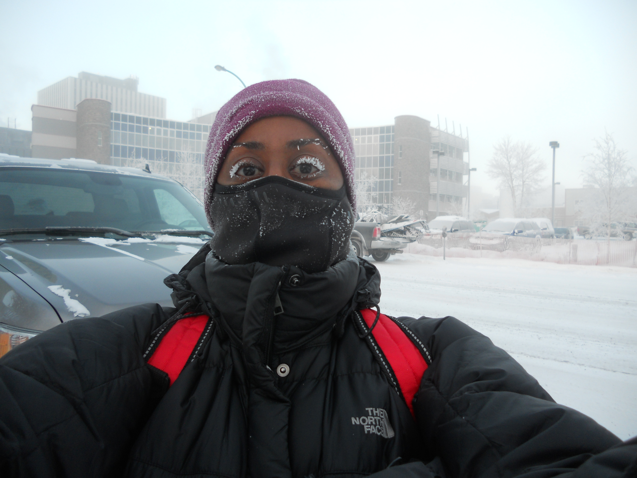 Such frigid, ice-foggy days have been more frequent this month than I remember for all of last winter. This has become a typical day this month: wake up, look outside, see foggy darkness, the kind of eerie scene that would be the perfect setting for a movie about zombies, or Jack the Ripper. (Menacing, possessed ravens might be more appropriate for a Yellowknife setting.) Check the weather report, which confirms that the temperature is -40 something, there are ice crystals in the air, but there’s hope: it will be a sunny day. Watch hopefully as the sun struggles to come up around 10am, makes a weak attempt to burn off the fog, and fails miserably. By 1pm it still isn’t very high in the sky, but it’s there, and around 3 o’clock it gives up and starts heading back to bed. (I could happily adopt that kind of work schedule myself) Since it doesn’t rise above the tall buildings, downtown looks quite grey and foggy on those days. Here’s what happens to your face when you expose it in those conditions. It looks worse than it is; my eyes don’t feel cold at all.