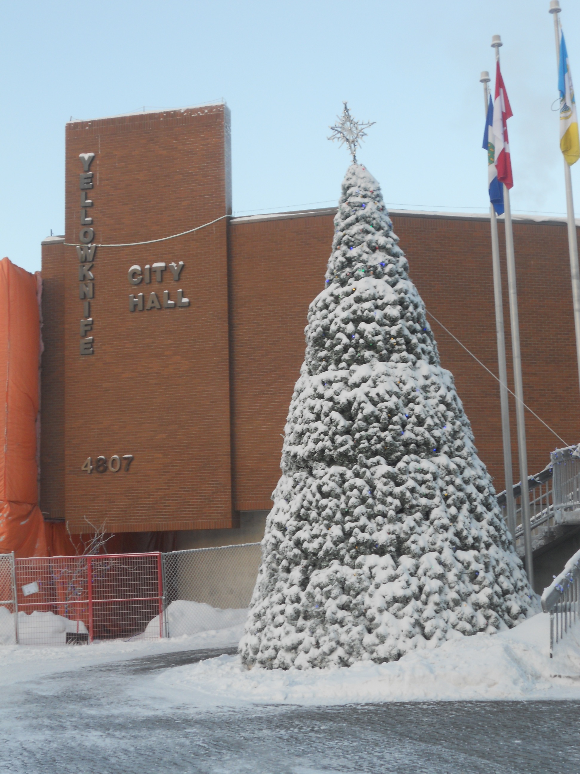 Perhaps it was partially to compensate for the lack of natural light that man-made Christmas lights were invented. Yellowknifers take their Christmas decorations very seriously. There’s a city-wide competition for the best display of Christmas lights, and many residents drive around town to take in the various entries. A giant Christmas tree at City Hall is lit in early December with great fanfare, after which citizens are invited to mosey over to the Legislature building (fondly referred to as “the Ledge”) to enjoy some refreshments and good cheer. I tried taking a picture of the tree at night, but the ice crystals in the air dominated the photo, and it was too cold and too dark for me to figure out how to turn off the flash. So this a daytime shot. There are lights under the snow and the tree looks even nicer at night; just take my word for it.