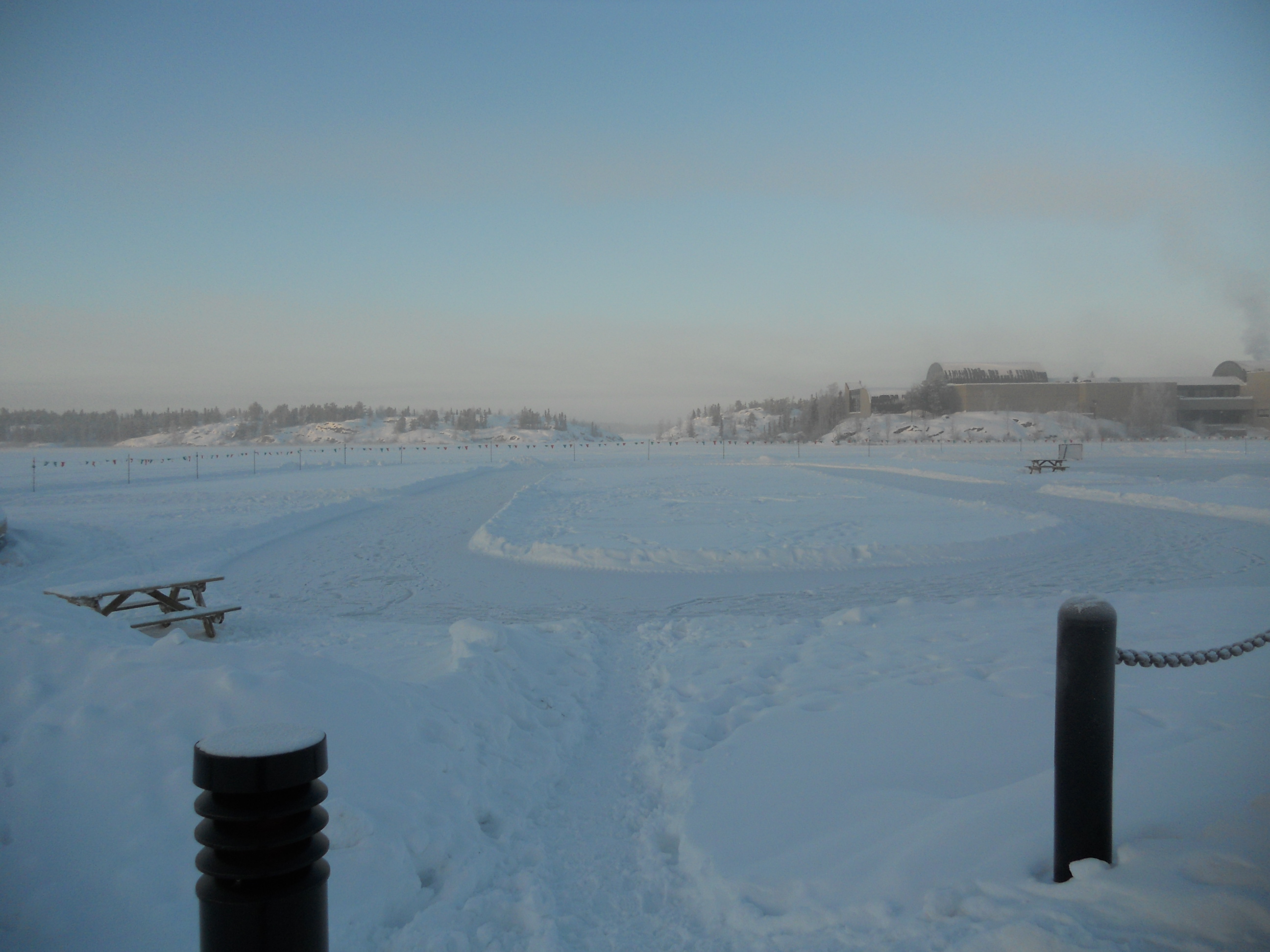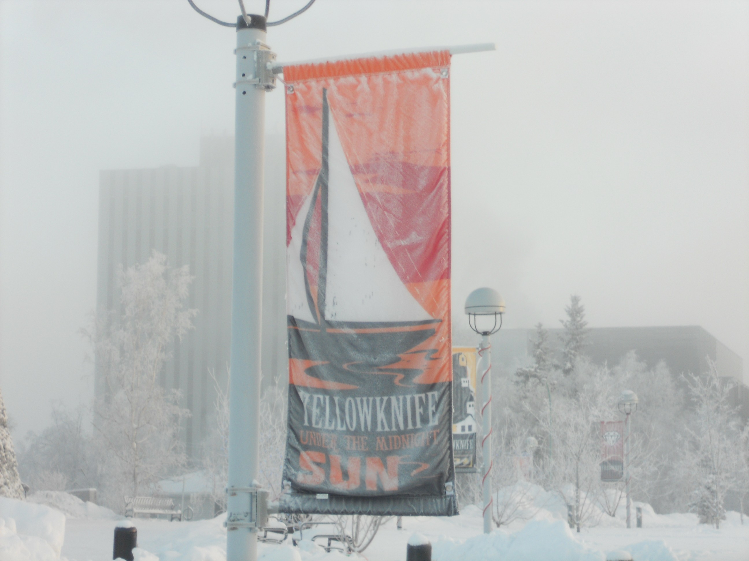 After the excitement over Christmas, there was the added excitement of a power cut this year, on December 29th, for about 3 hours. Power cuts occur all the time in Yellowknife, but not often for such a length of time. They’re definitely more tolerable during the summer than during the winter. In summertime, I simply get out my candles and I don’t worry about it. But when there’s no power in wintertime, I am reminded of how dependent we are on electricity for basic survival. Without a generator or a gas stove, I have no means of generating heat of any kind. I can’t even boil water to make some tea to warm my body. My car might be a source of heat, but if it’s really cold it won’t start without a block heater, and I have no way to run the block heater without power either. It’s a bit scary when I think about it, so I don’t think about it. I just put on another layer of clothing and hope that the power is restored before I start to freeze. I feel like one of those banners around town that advertise the city of Yellowknife: frozen and shrouded in fog, but holding on to images of sunny summer days.