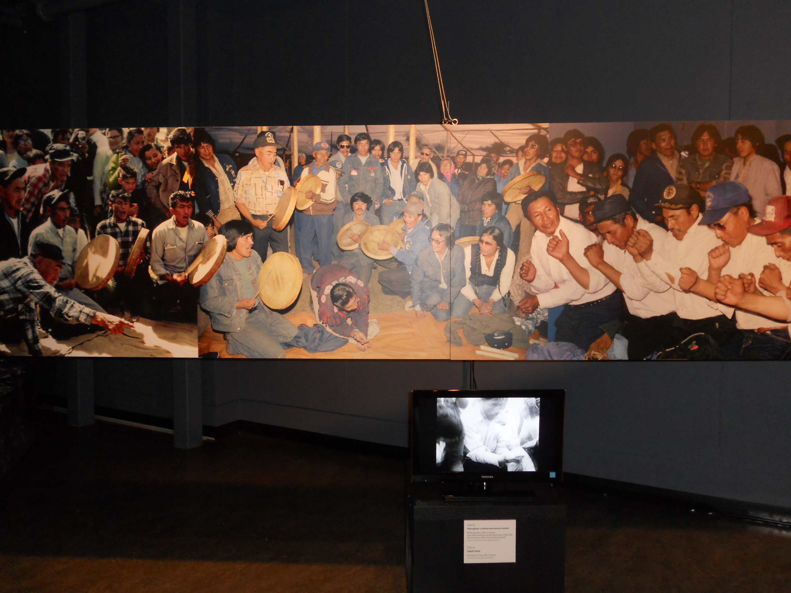 For the lesson, there were 2 teams of 6 players each, and it was explained that traditionally, the game is played by men only, but in some places farther north and in the Yukon, women are allowed to play. However, our very personable instructor – who also happened to be one of the Denendeh drummers – graciously made a local exception, for the sake of learning. The game is played on the ground, with the teams kneeling on a blanket, mat or a tarp, facing each other. There’s a referee on either end, to arbitrate disputes and to ensure no cheating. Essentially, each member of one team hides a token in one hand. Tokens can be stones, coins, whatever is handy. The captain (or designated guesser) of the opposing team has to guess in which hand each of them has it. For every wrong guess, the captain has to give a counting stick to the hiding team. At the start, all of the sticks are in the “neutral” middle ground and they are placed beside each team as they are won. When all of the neutral ones are gone, the teams can take sticks away from their opponents. The objective of the game is to win all of the sticks. That’s it in a nutshell, but it’s not as simple as that. In fact, it is a game of strategy, tension, deception, posturing, psyching out of opponents, and pure, unadulterated, rollicking good fun. It can also be a serious game: in days gone by, there used to be about 40 players per team and they didn’t play for sticks, but for valuable items such as toboggans and rifles, and nowadays, there are tournaments where there is big money to be won. People can play this game for days. It is such an important part of the culture that there are exhibits at the museum of games played in various eras, such as this one.