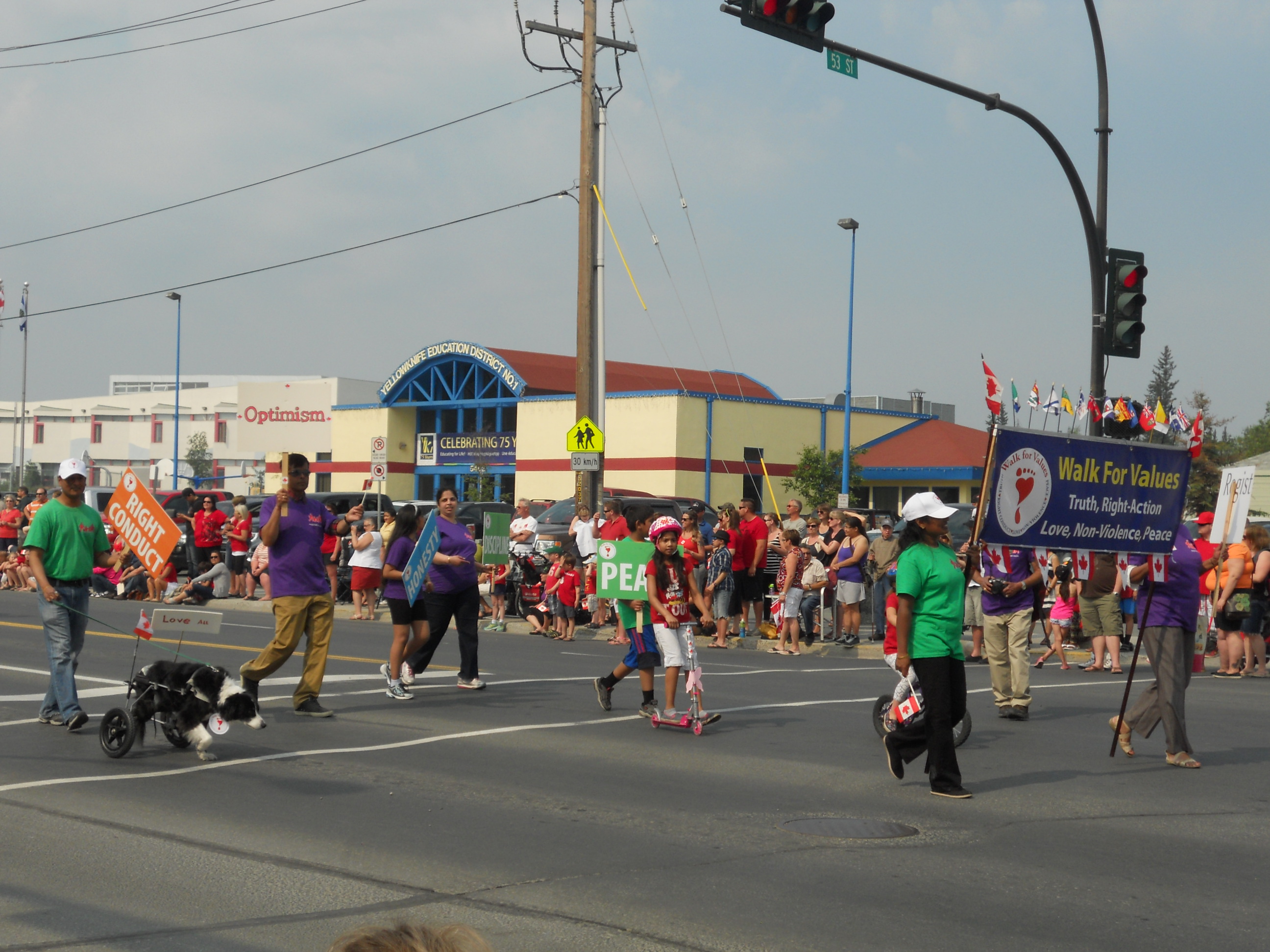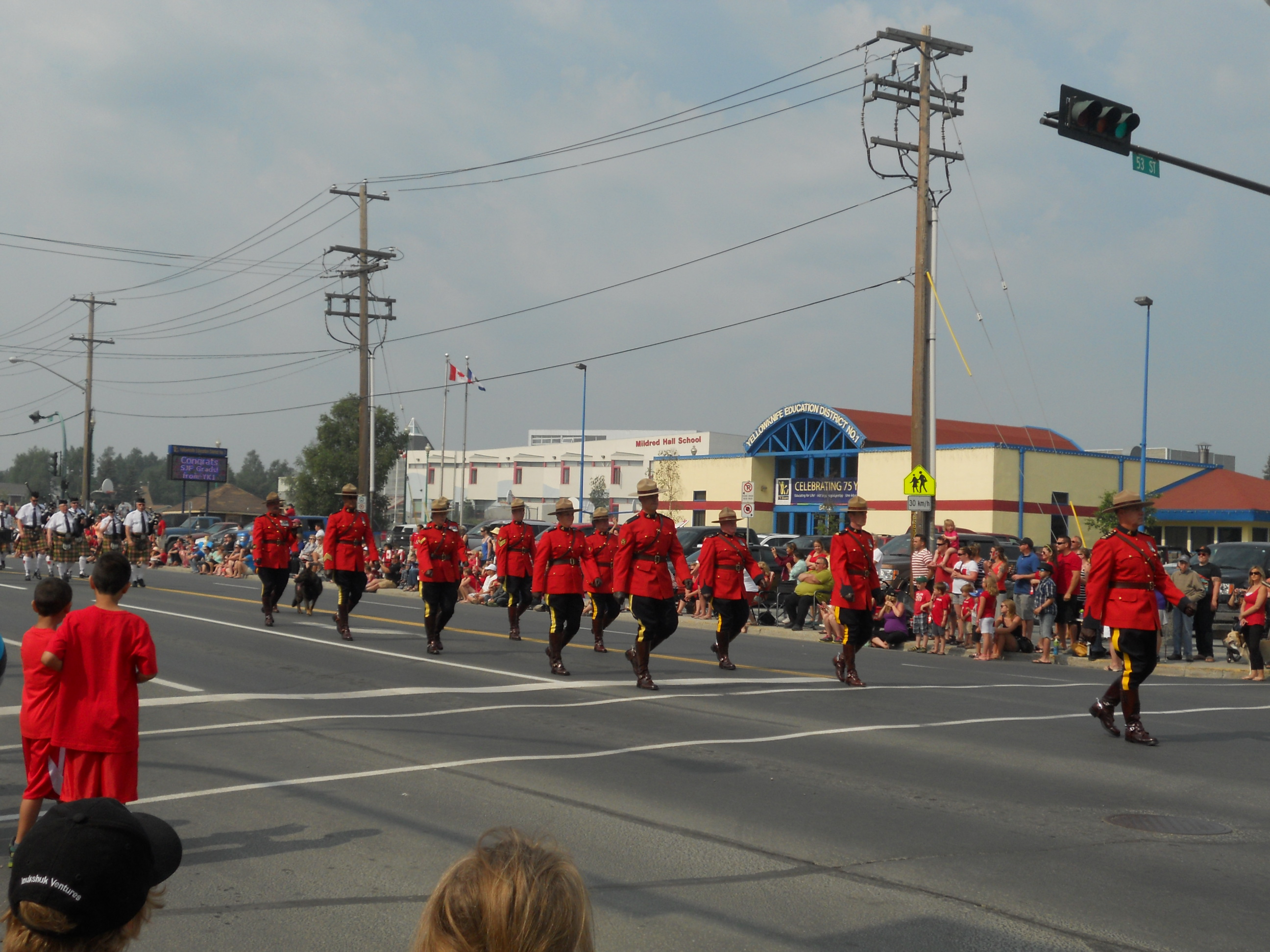 Meanwhile, life goes on. This year the Canada Day parade took place under a slight haze. I managed to attend for the first time, joining the throngs in the sea of red and white along Franklin Avenue, the main drag. Among them were lots of kids, ranging from the irritated and tired of waiting, to the bouncing around with excited anticipation, and parents trying to keep them out of the roadway. Any group that wants to participate in the parade simply has to pay a fee at City Hall, so there was a wide variety of floats and paraders on foot. The RCMP started things off, in their distinctive red dress uniforms. Perhaps I should call them the RCP, because none of them was mounted.