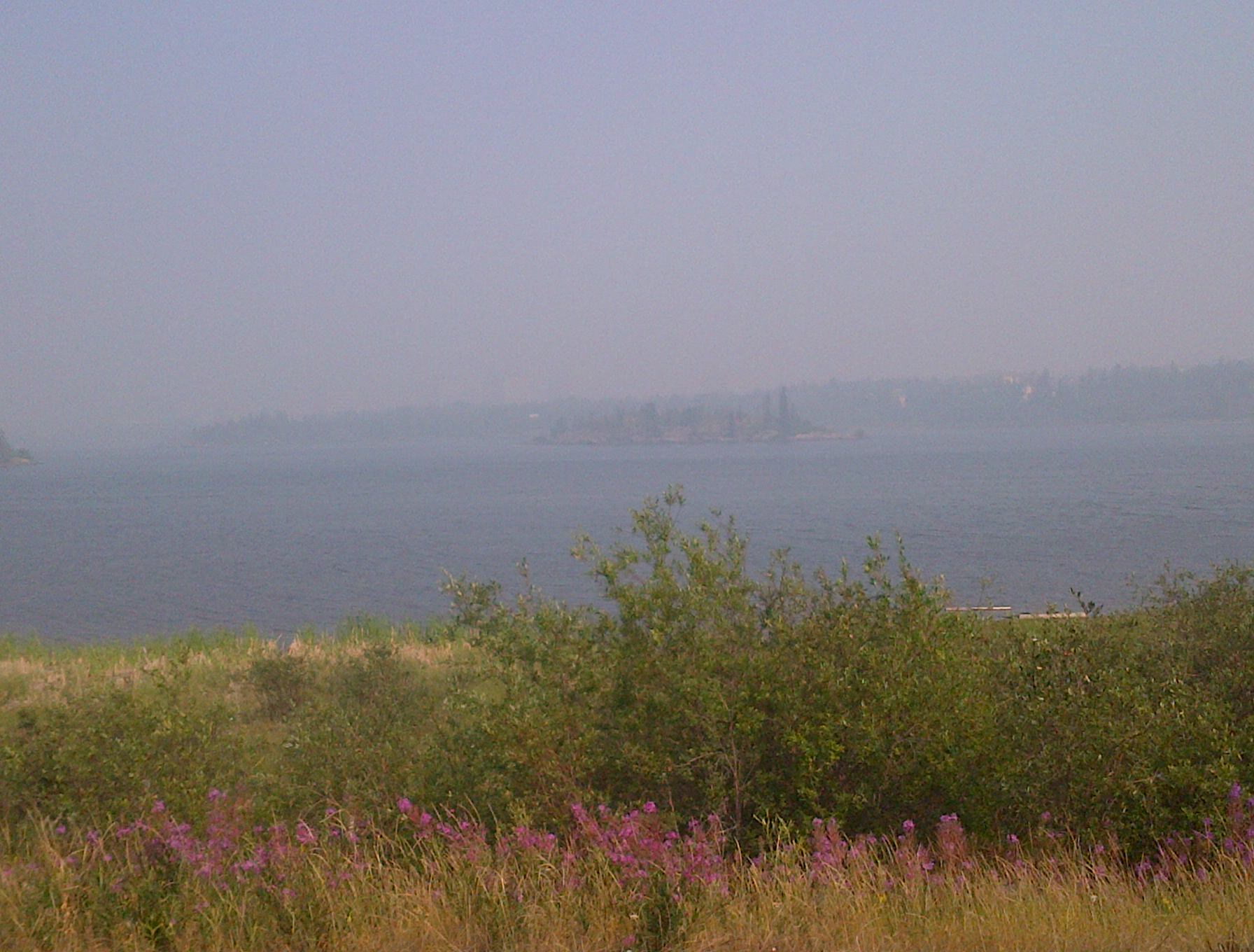 As forest fires continue to rage across the Northwest Territories, the air in Yellowknife has been tainted with smoke almost every day, and the forecast has changed from “local smoke” to “widespread smoke”. It varies in density, from a slight haze to a heavy fog. On bad days you can’t see the downtown buildings across Frame lake from the other side of town. You can barely see the buildings even when you’re in town, for that matter. Nobody would blame us for singing a revised version of the song: