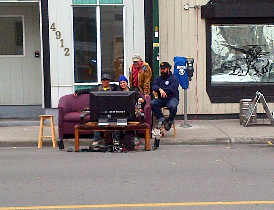 Just outside the pub, somebody decided to park a couch and a couple of stools on the sidewalk, plant a television in the street, and invite passers-by to stop and watch a movie. This was by far the wackiest use of a parking spot that I witnessed.