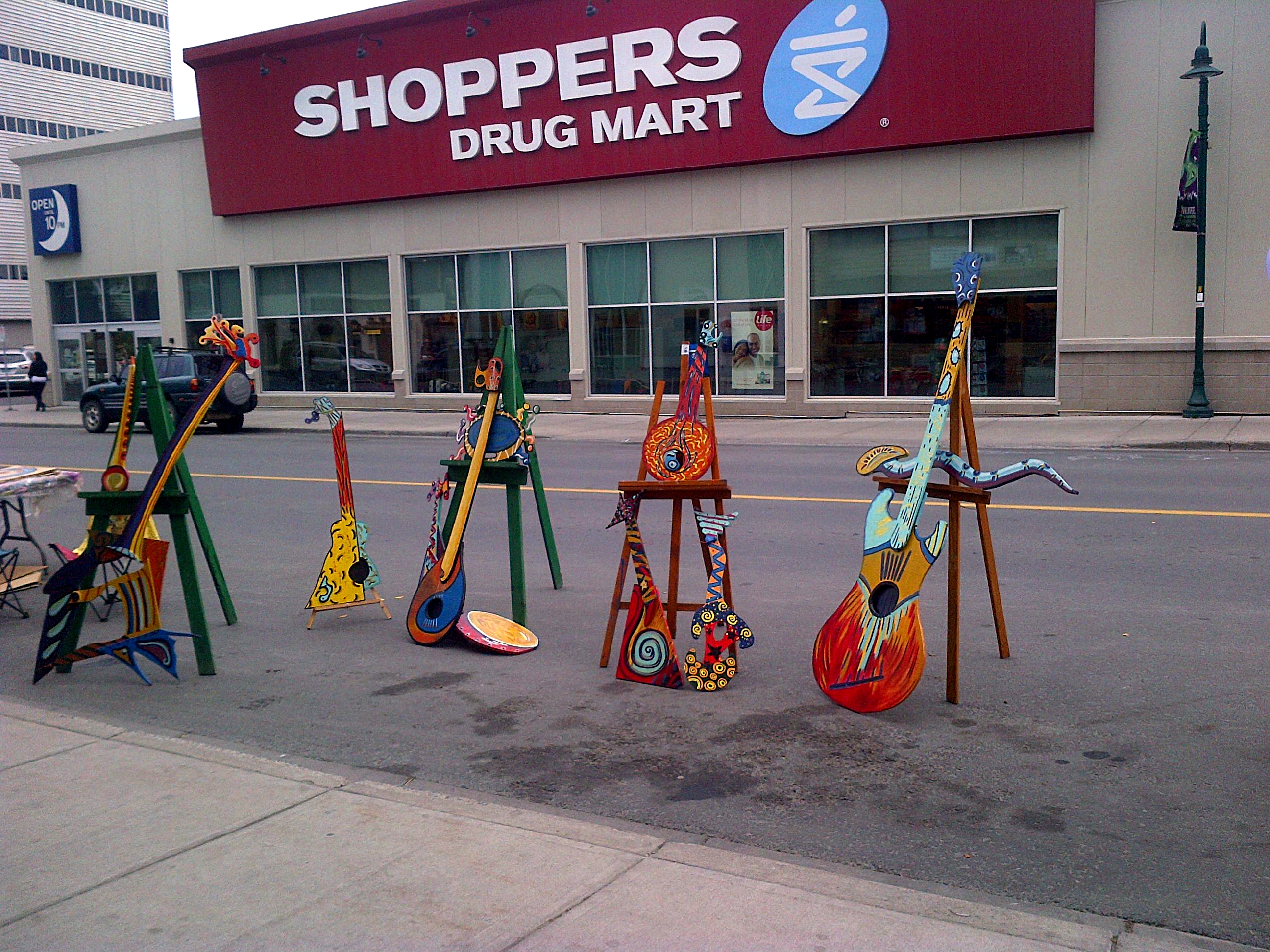 Opposite the drugstore, some gaily-painted guitars and other string instruments begged to be played.