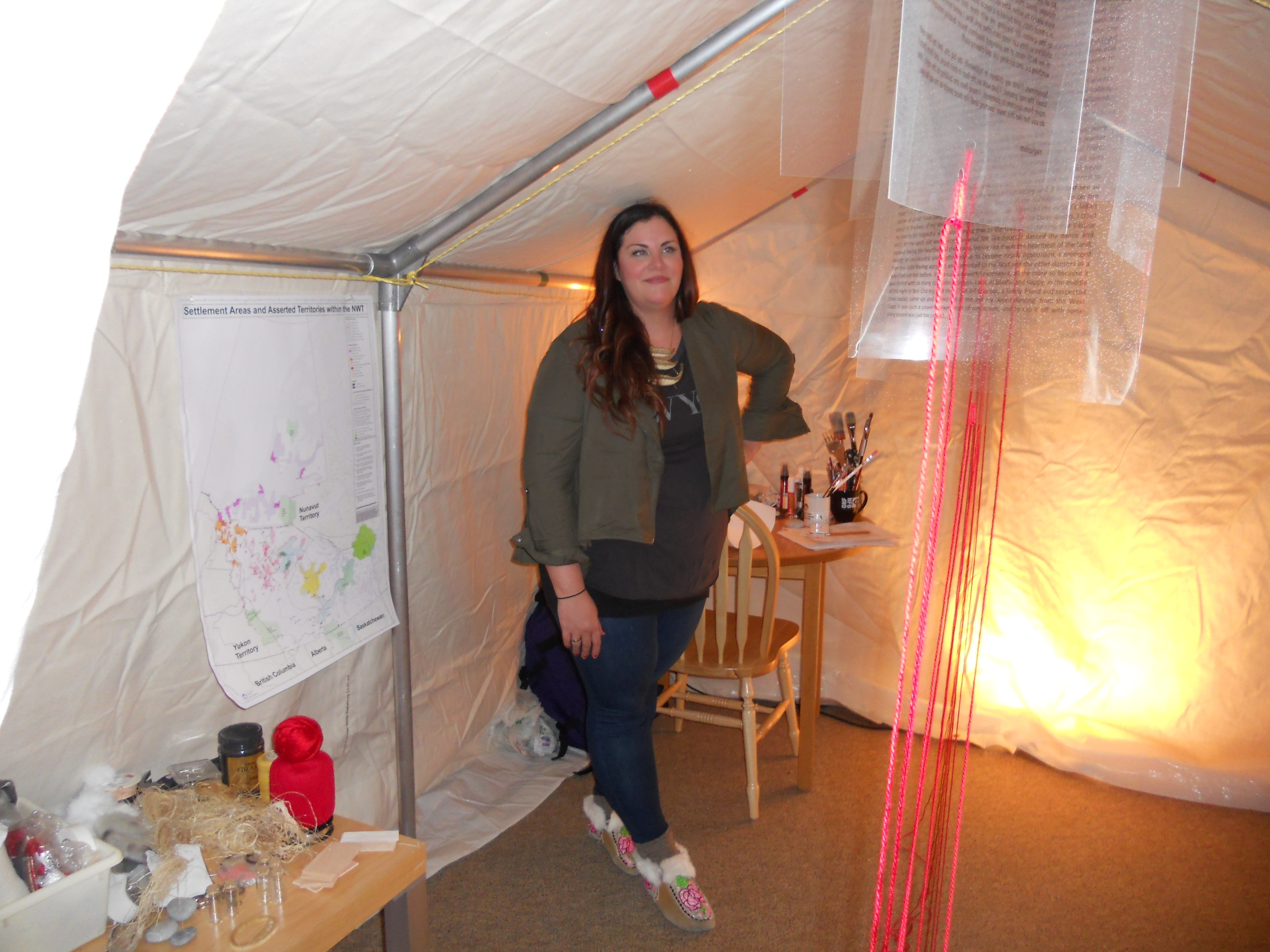 Arts Week offered an intriguing installation called “Stolons”, by Northwest Territories artist Courtney Chetwynd. She gathered stories from northern residents and translated them into pieces of art. The stories were typed on transparent sheets, which she strung up inside a tent. She secured to them a length of red string. The strings from the various stories all ran outside the tent and became intertwined, to signify the common human connection. Like a shoot from a plant, the pices of art sprang up at the other end of the string.