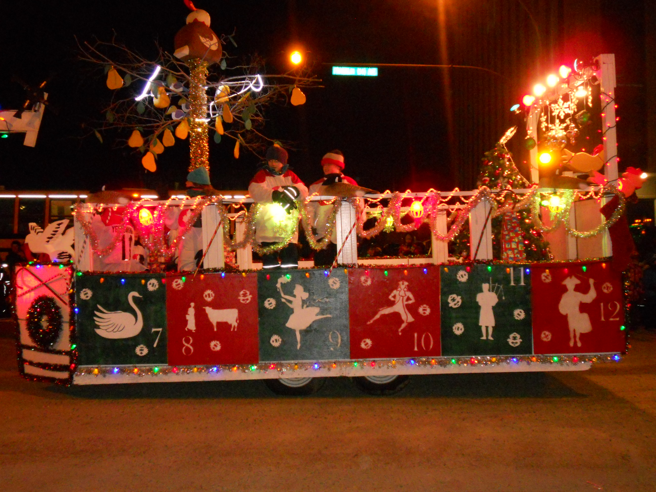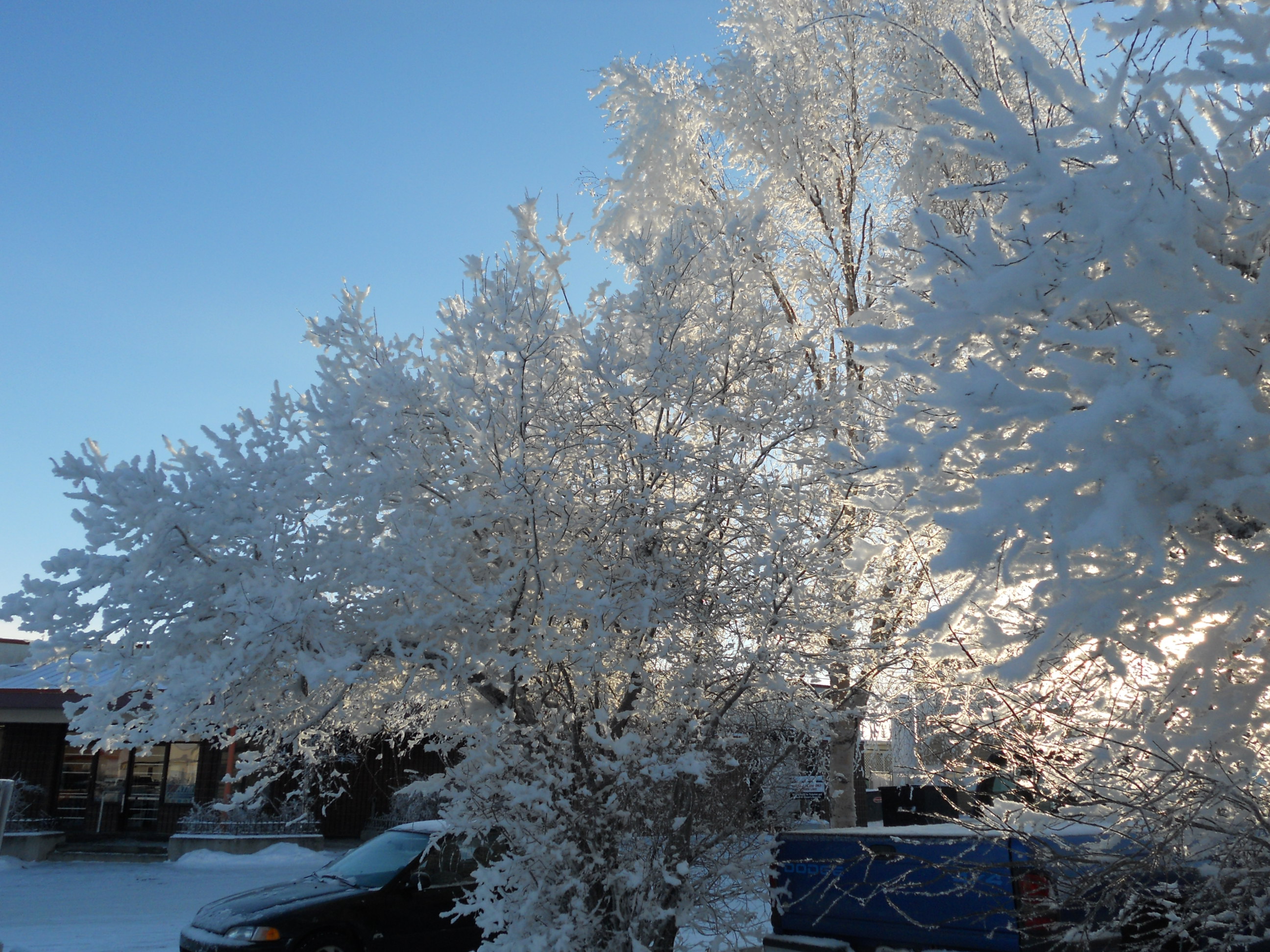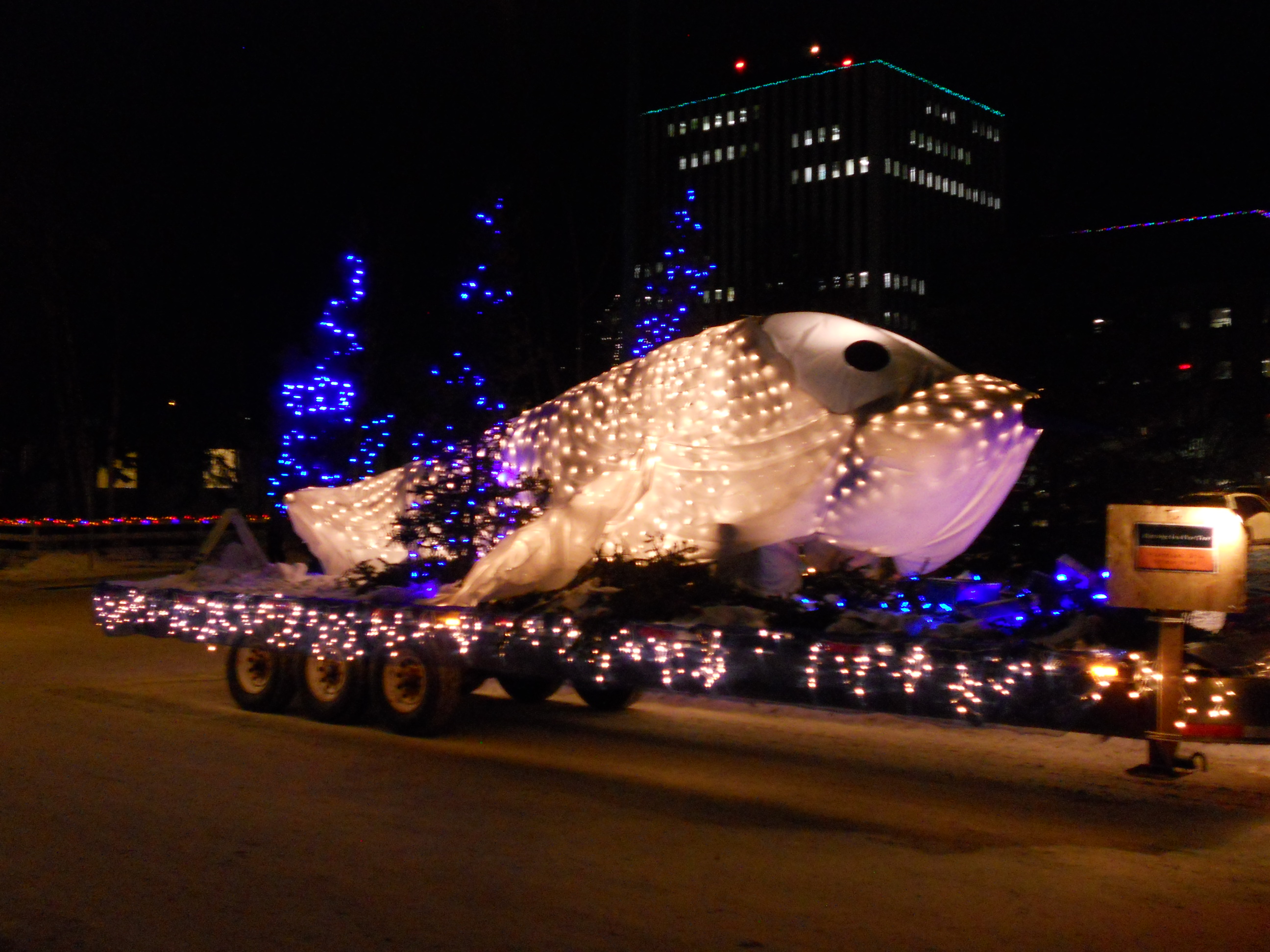 Before we could blink twice after Hallow’een we were into Christmas, and as I’ve informed several curious or bantering friends, there are no polar bears in Yellowknife, so the Santa Claus parade was held as usual. It strikes me as a bit odd that it’s held at night, given that the target audience is children. It’s not as if there’s a ton of traffic to divert. I’m guessing that it’s to show off the Christmas lights to the maximum. It was held on November 15th, by which time the temperature had suddenly plunged, the snow was definitely on the ground to stay and there was hoarfrost on the trees.