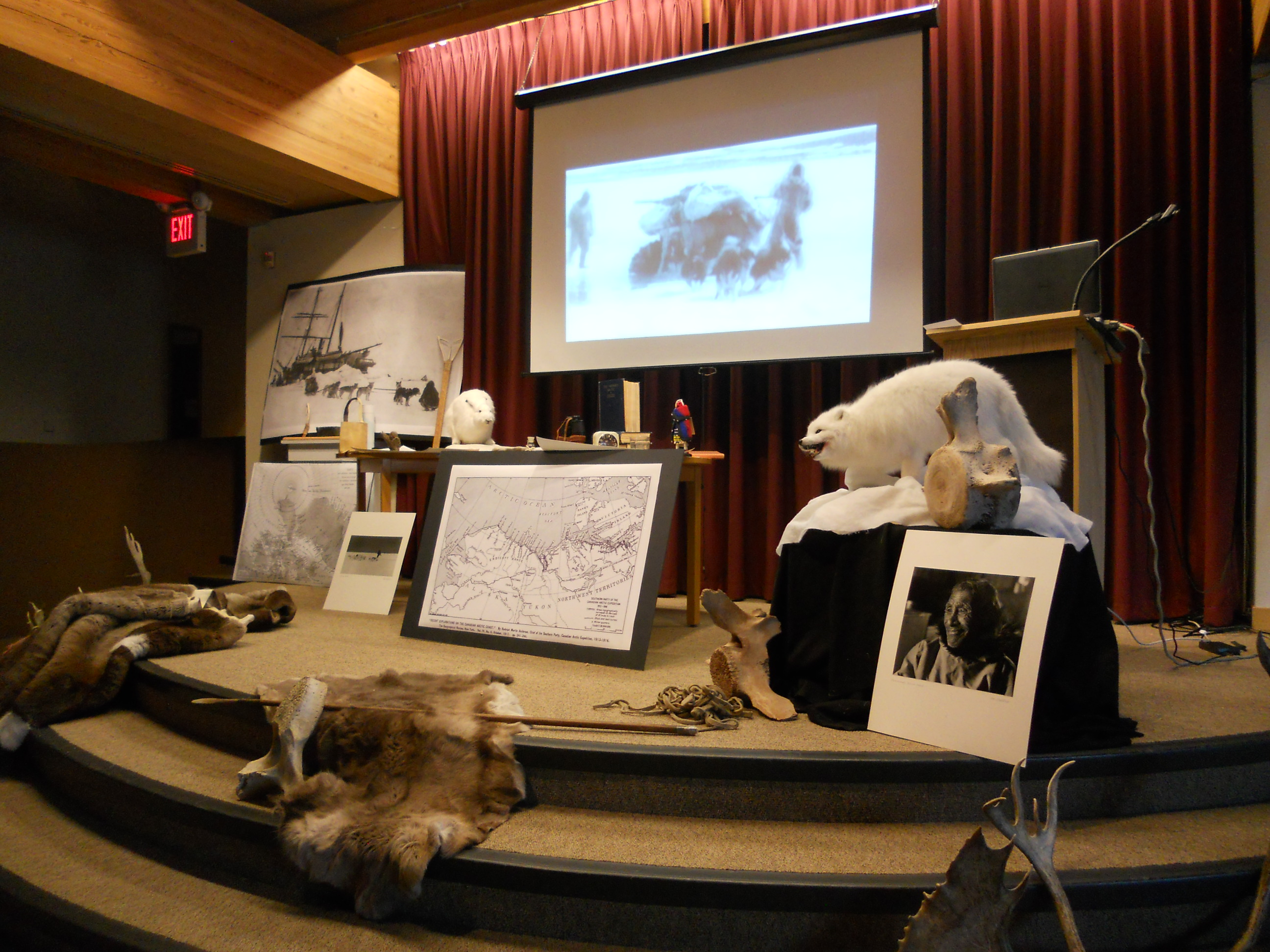 The theme moved from whether the environment will survive humans to how humans survive the environment in the north, in a one-man play put on by Jamie Bastedo. He played the arctic explorer and anthropologist Vilhjalmur Stefansson and recounted his arctic expeditions of 1906, 1908 and 1913. There was a lot of attention paid to detail on the set, which was composed of pictures, artefacts, animals in whole and part (antlers bones, and fur) as well as early maps of the Arctic, based on the understanding of the terrain at the time.