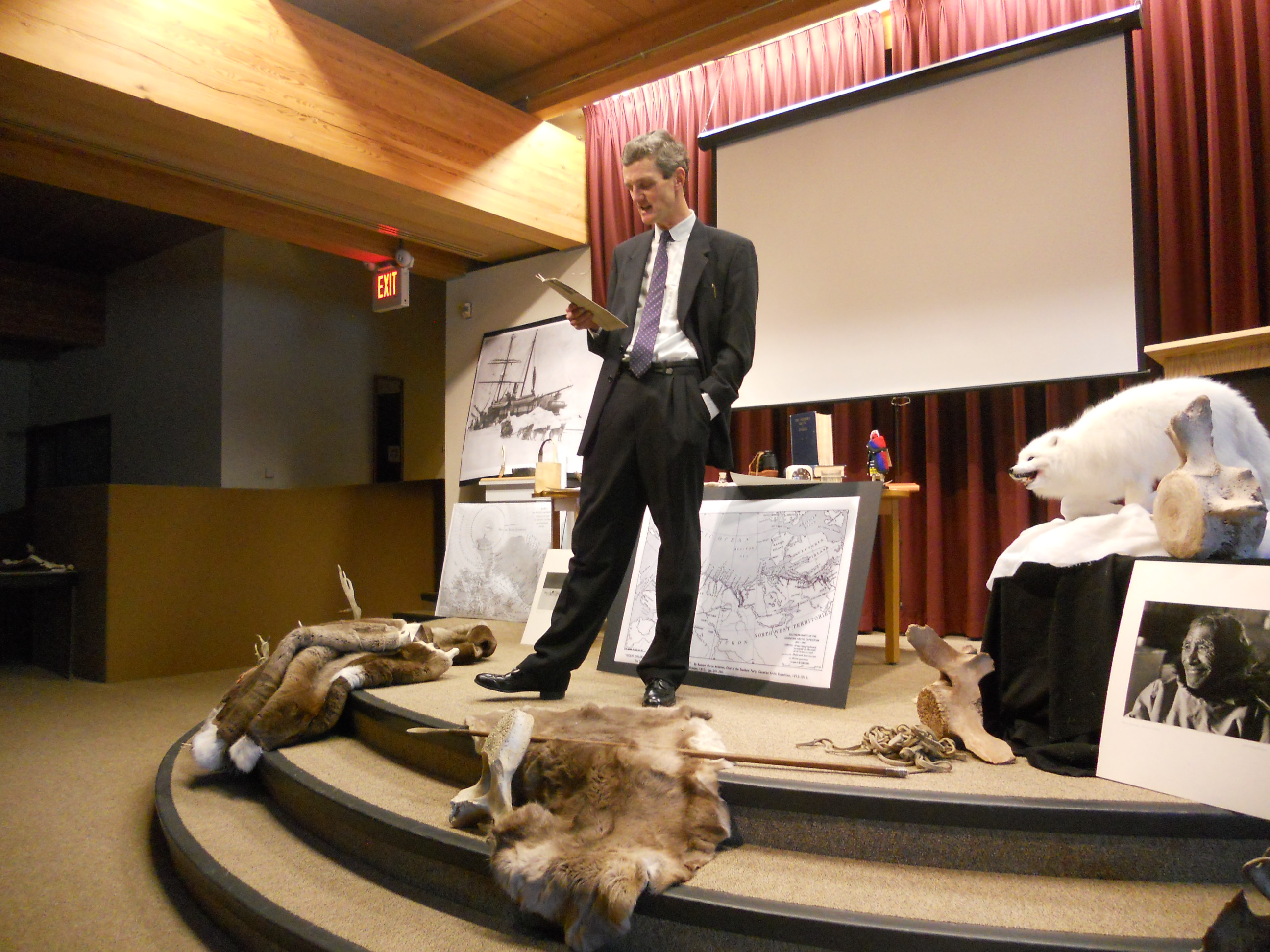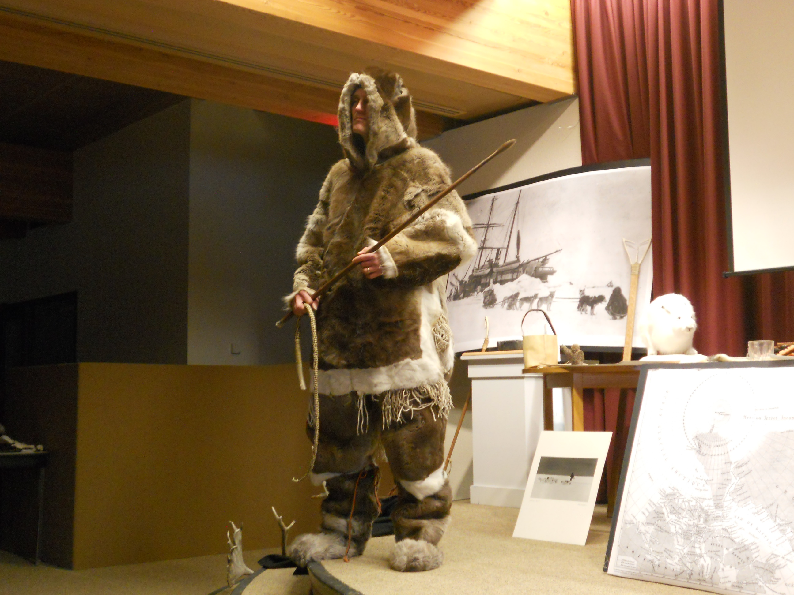 As an anthropologist, Stefansson kept a diary, making all of his observations in a series of notebooks. He drew on them for his book “The Friendly Arctic”. His view was that anyone could survive in the Arctic simply by doing as the Inuit do: eat the same diet, dress in the same fashion, and above all, use common sense. By the end of the play, he had exchanged his suit for traditional fur clothing, looking like quite the hunter with his spear.