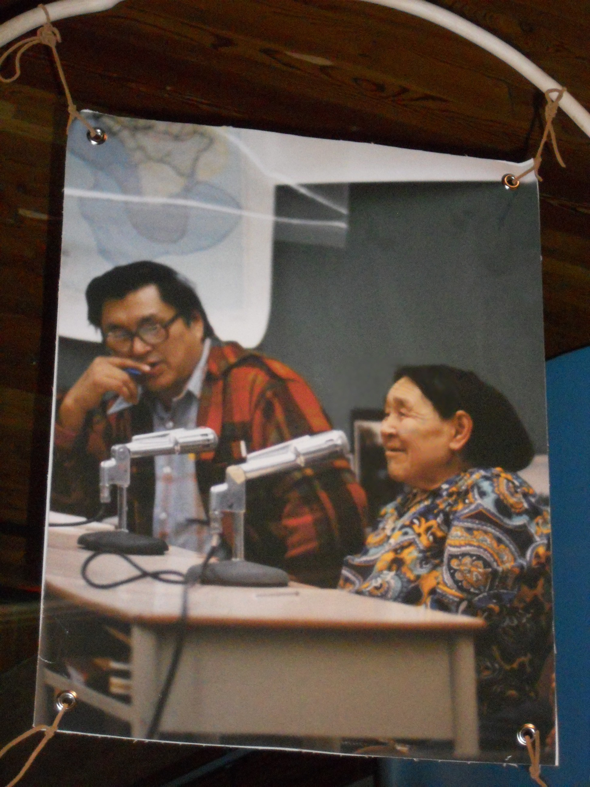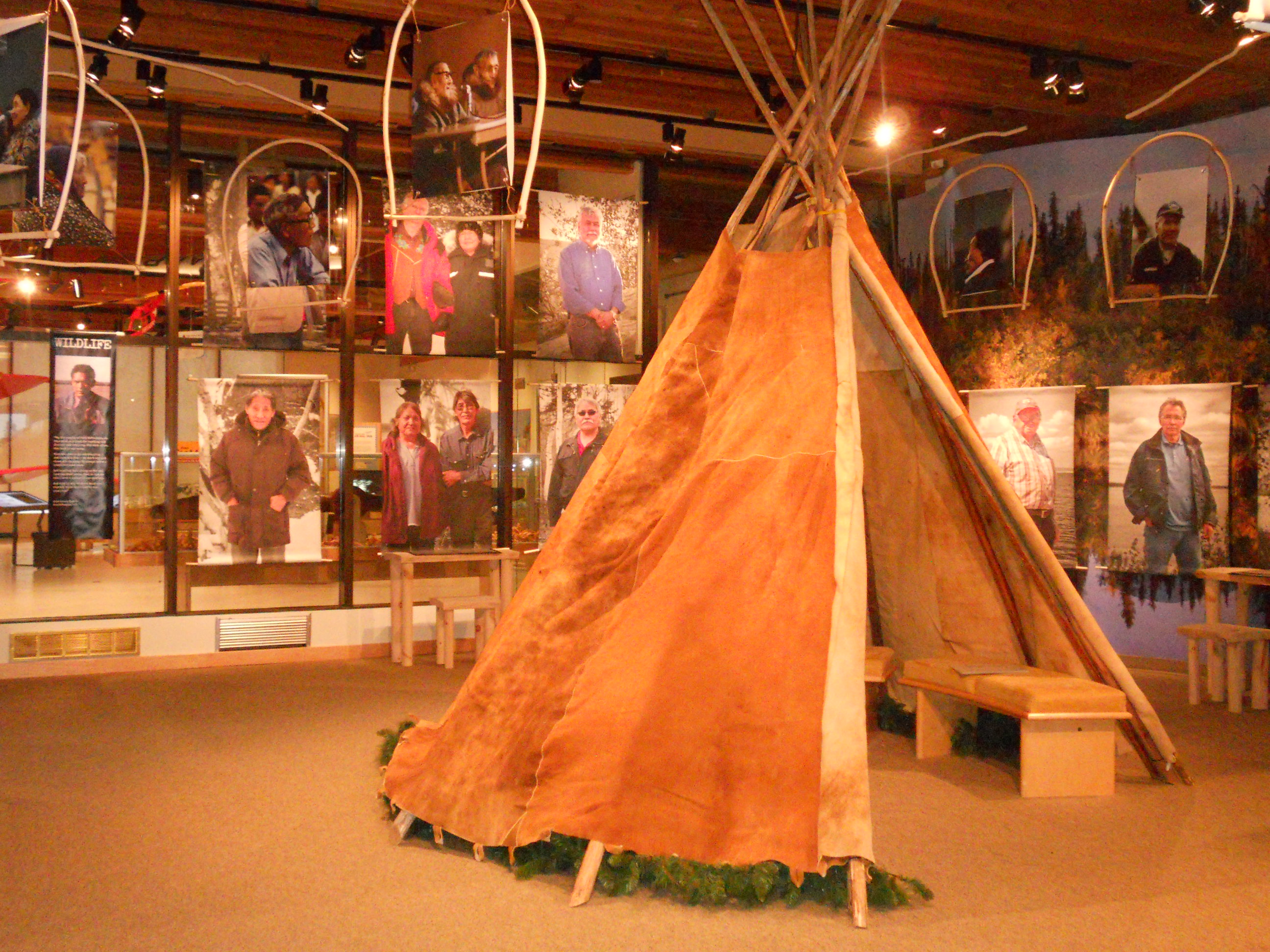 Strung from the ceiling, on beaver hide stretchers, are various pictures taken during the inquiry. Needless to say, people did not want the pipeline because of the damage that they foresaw it potentially doing to the environment. The feeling among some was that if they allowed a gas pipeline, an oil pipeline would soon follow, and an oil spill would do untold damage. Testimony was about the effects of such a pipeline on marine and land animals, all of which play a role in the circle of nature that sustains the population. The rights to the land were also in great dispute.
