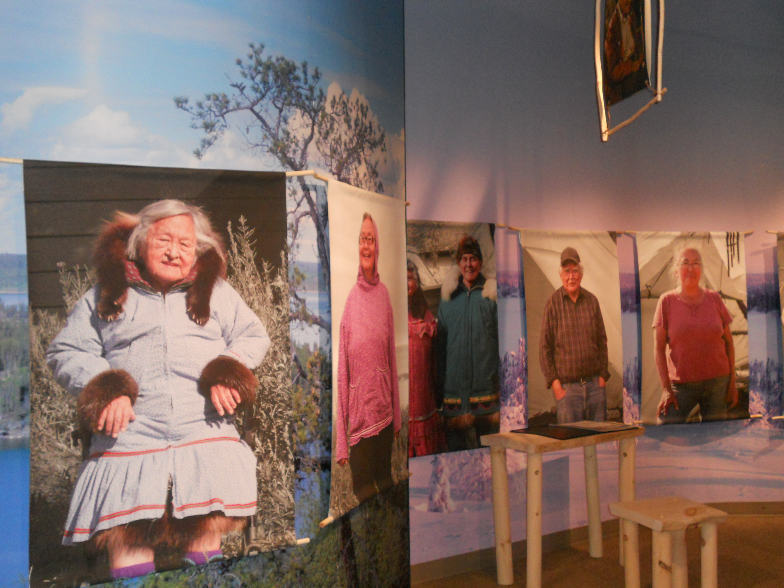 Outside the tipi, hanging on the walls of the space, there are large, current-day portraits of key people who testified at the inquiry. At 3 stations around the space, there are binders containing the reminiscences of these same people, usually with 2 photos of them: one that was taken during the days of the inquiry and a head shot of them today. It’s interesting to match the head shot with the person in the large portraits, and to see them as they were 40 years ago. As is typical in Yellowknife, you always see somebody you know.